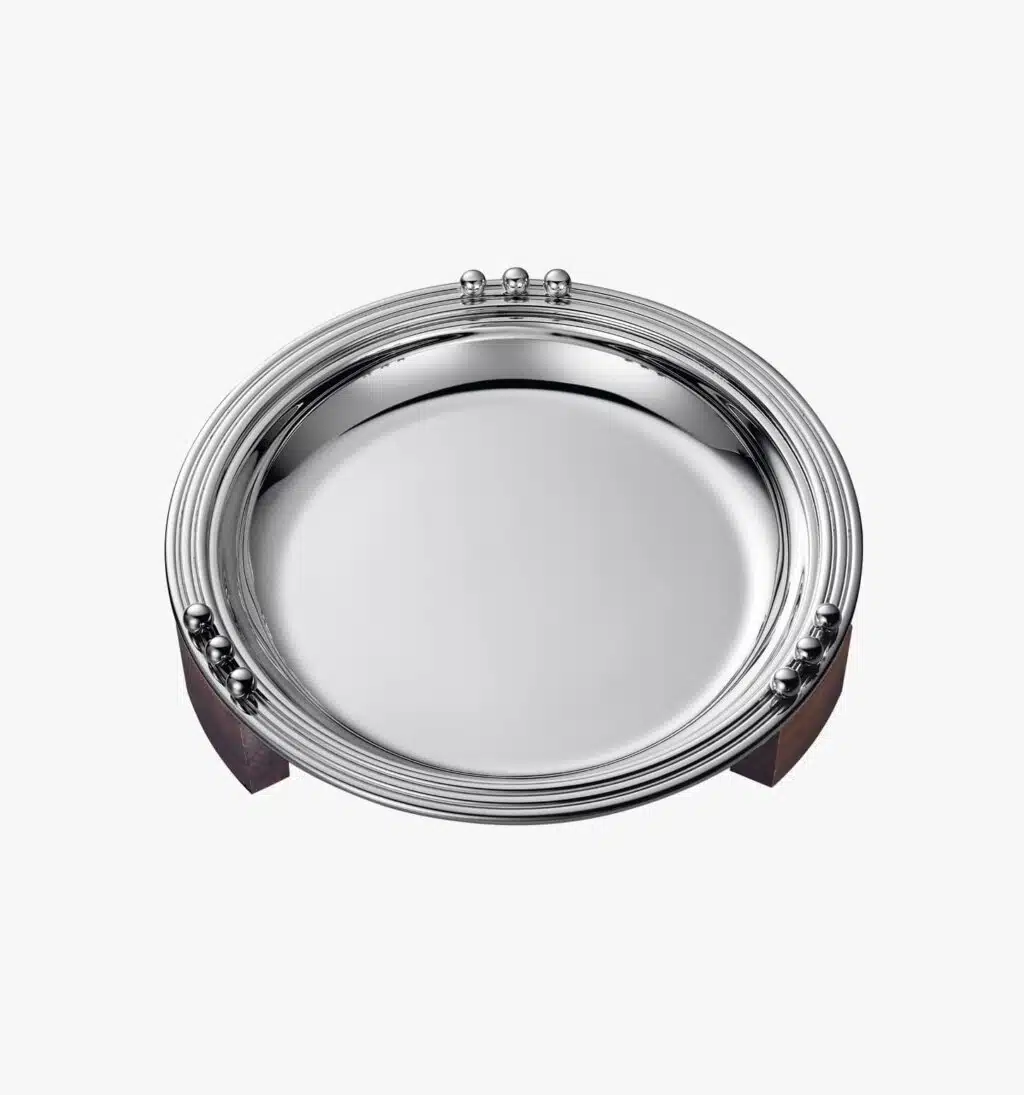 Silver platedInspired by the Art Deco architecture of the Basque country, Jean Puiforcat displays his virtuoso savoir-faire as a master silversmith with this set, designed in 1937. The oblong shapes of the various silver-plated metal pieces blend simplicity and attention to detail. Their sides, decorated with fine vertical fluting, contrast harmoniously with the rounded shape of the rosewood handles. Metallic pearls enhance the top of the handles and add a touch of light to the ensemble. A refined dialogue between sophistication and simplicity.
