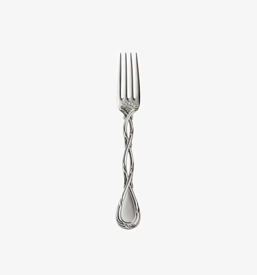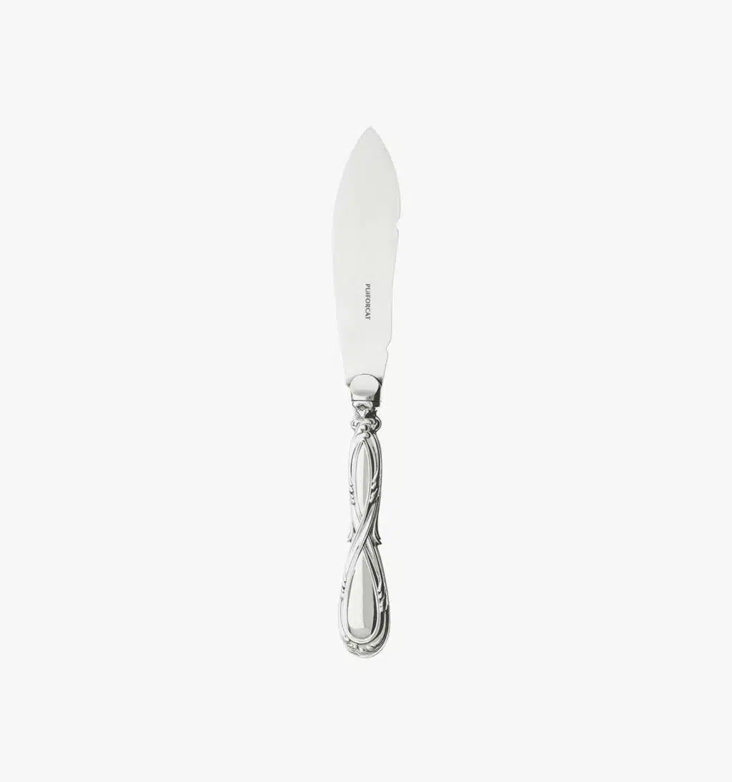 Sterling silverLouis-Victor Puiforcat, transformed the simple family cutlery shop into a renowned silversmithing workshop at the end of the 19th century. He drew his inspiration from the masterpieces of past craftsmen, which he revived. Thus, the Royal line of cutlery had been conceived by 18th-century silversmith, Nicolas Cornu. Its curved sterling silver handle, is enhanced by an elegant interlacing of rocaille branches. The set’s sophistication demands the perfect mastery of traditional craftsmanship, including the delicate lime finish. The collection, is also available upon request in gold immersion finish.