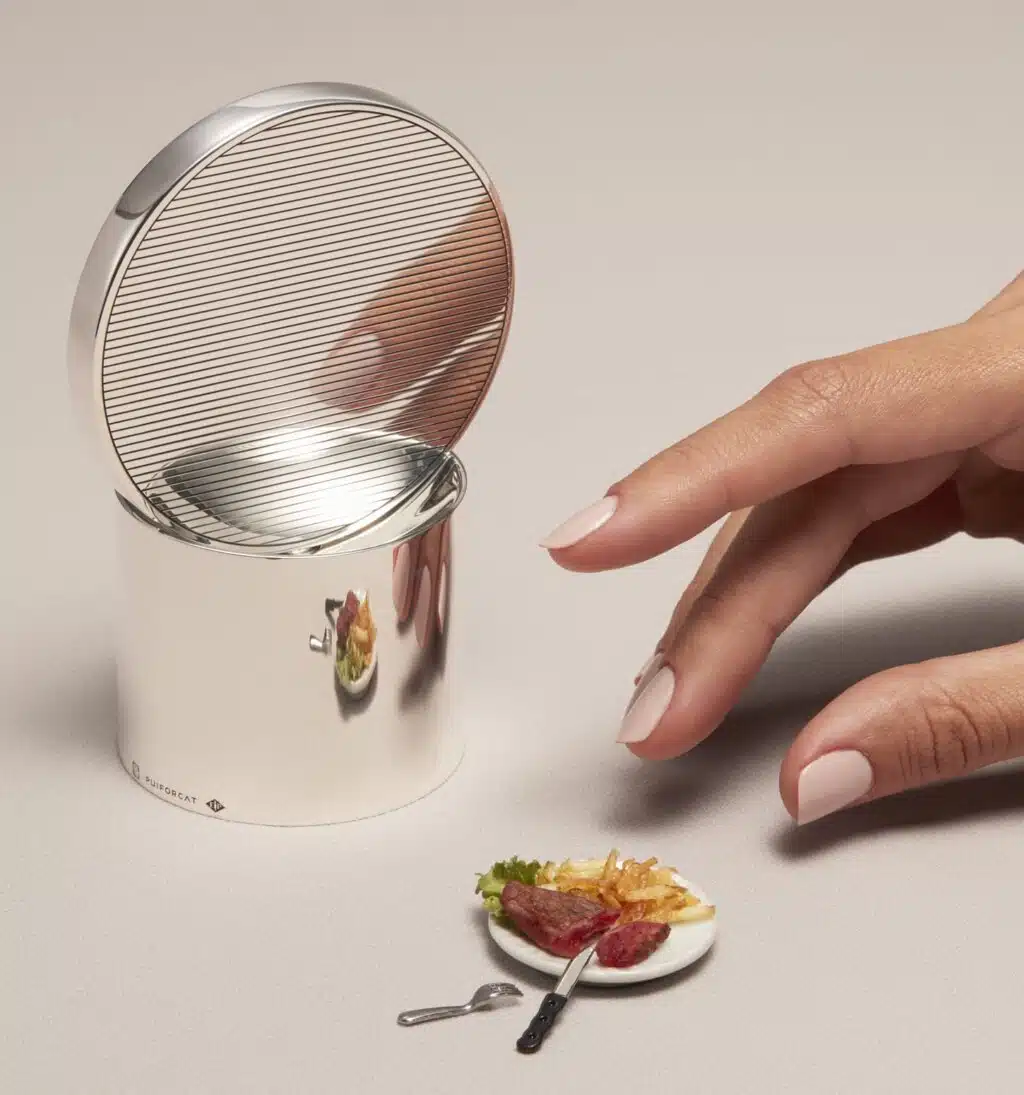 Puiforcat expands its aesthetic repertoire with these sterling silver salt and pepper mills, veritable table ornaments as envisioned by French designer Grégoire de Lafforest. Their cylindrical bases are topped by two vertical disks, in sterling silver for salt and gold immersion for pepper. Their Peugeot© mechanisms, operated by the rotation of the disks, combine an innovative design with a feat of technical engineering.